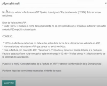 Luego, una vez que el webservice funciona normalmente proceder a corregir en Odoo, en caso que se presente el error 10016.