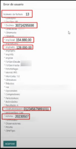 Los datos resaltados en rojo, son útiles al momento de realizar la carga manual, nos permite en primer lugar corroborar que la “factura en borrador” (origen del error) es la correcta, coinciden en numeración e importes bruto y neto.