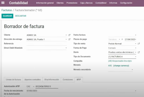 En la “factura borrador” me dirijo a la solapa AFIP, y con los daros que me brindo Odoo sobre la última factura; procedo a completar con el nro de CAE y fecha de vencimiento.